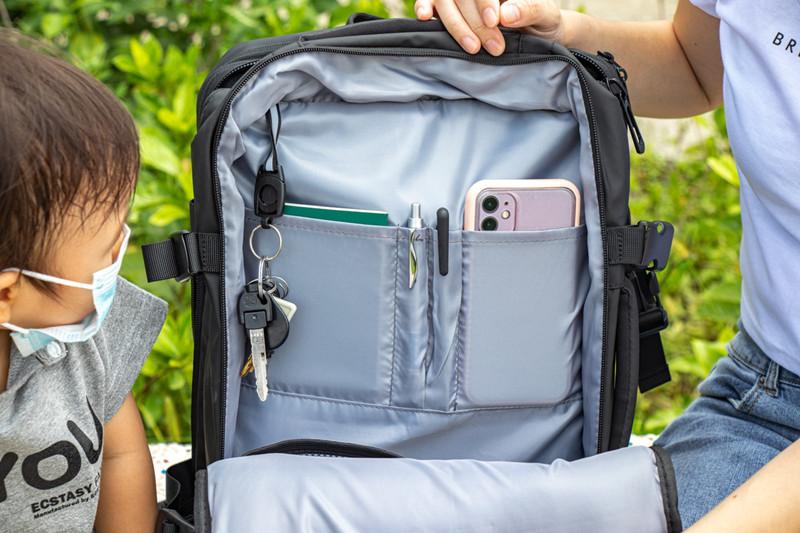 Nazoroad Alter後背包擁有三層大收納空間,加上無數的小空間暗袋收納,前置口袋放上一罐消毒水,第二層中置暗袋可以放手機、錢包...等等常用物品,最強大的是下圖▼的第一層內袋有鑰匙吊環、筆袋、手機袋,還有一個證件袋置納空間,完全就是超實用的機能包~無誤!