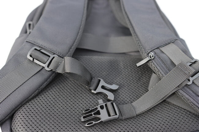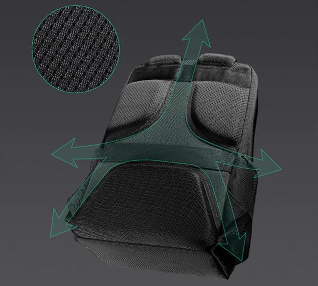 背包背部有高彈性抗震抗壓帶,而且相當透氣,不會悶熱。同時背起來會緊貼後背,受力均衡,不壓迫肩膀