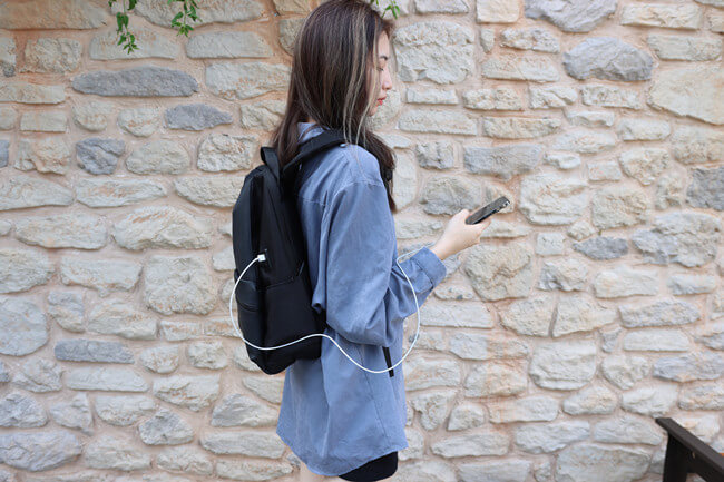 USB孔有專屬的蓋子可蓋上,避免裡頭的插槽受損,邊走邊充,移動電源可放在前袋內袋