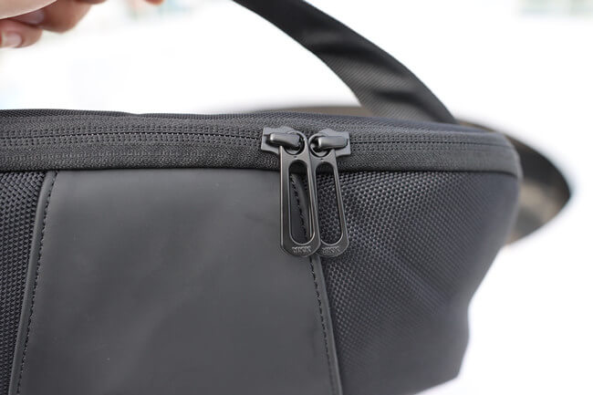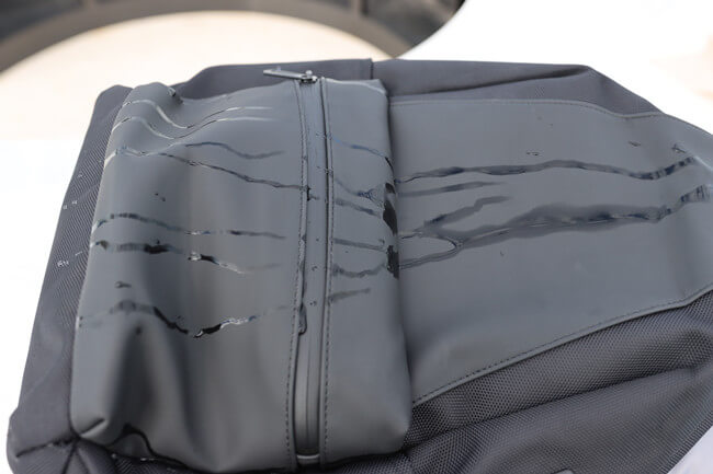 採用PU面料,材質不吸水,可以抵禦小-中雨,前袋拉練採用防水拉鍊,可以有效保護袋內物品